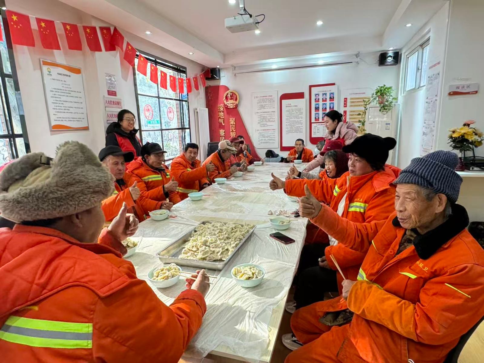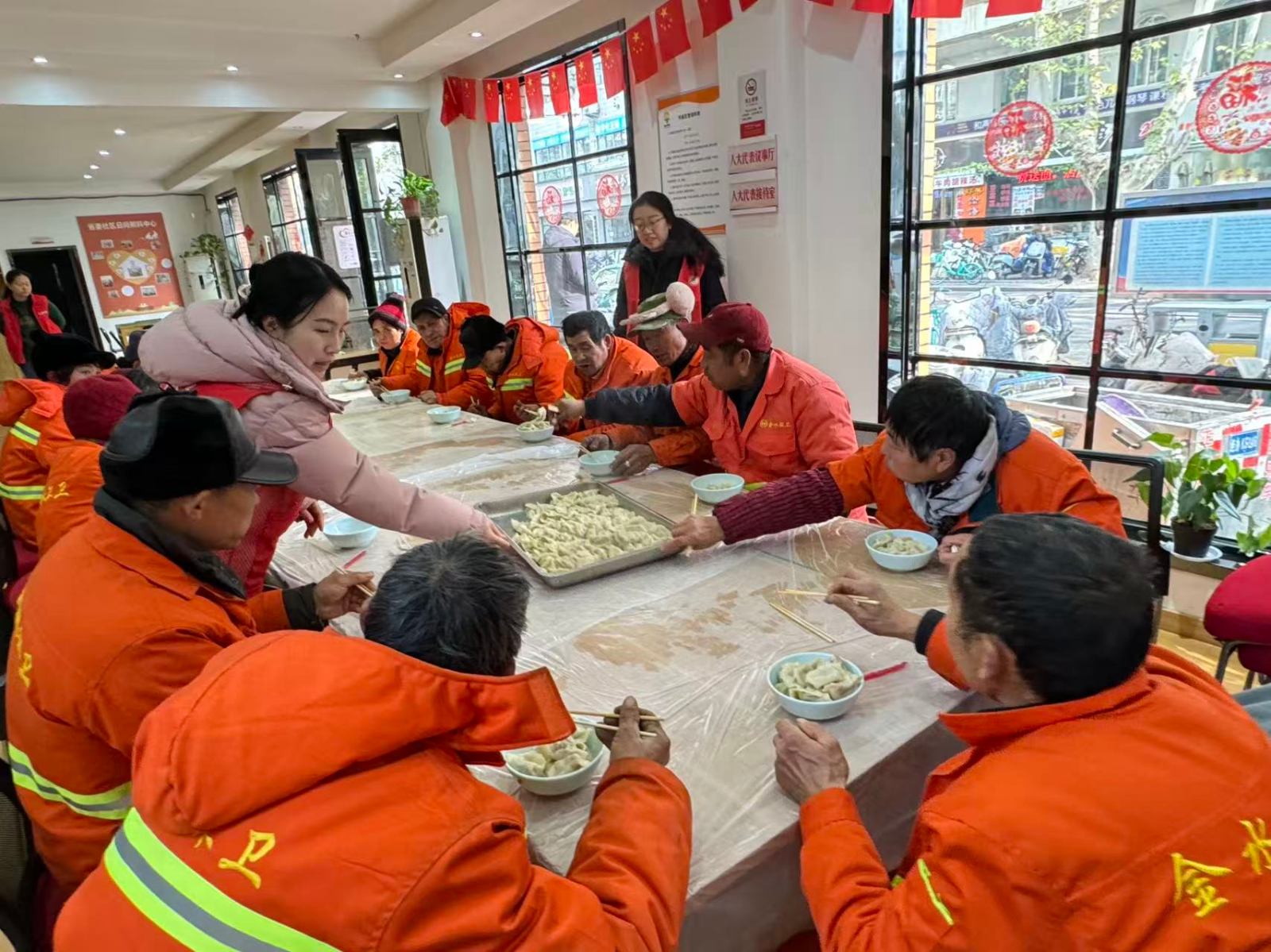 活动现场暖意融融、热闹非凡,社区志愿者分工协作、动作娴熟又配合默契。欢声笑语间,一个个饱满圆润、形态各异的饺子很快摆满餐盘。饺子煮熟后,志愿者细心分装,逐一送到环卫工人手中,邀请大家围坐在餐桌前共享热餐。