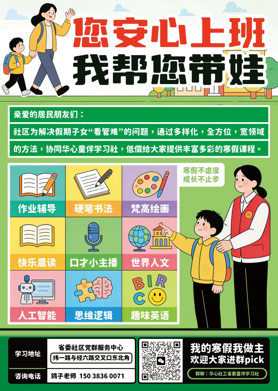 时间:暂定年前(10天)2月2日至13日,年后(5天)2月24日至2月28日,周六日除外,有需要居民进群咨询,联系电话鸽子老师15038360071。